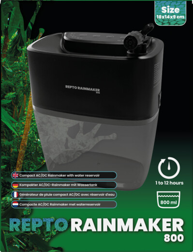 Een regenapparaat heeft in een terrarium meerdere functies. Het automatisch sproeien van het terrarium verhoogd niet alleen de luchtvochtigeheid maar zorgt ook voor een goede plantengroei. Daarnaast vinden veel -met name- boombewonende dieren het fijner de druppels te drinken dan te drinken uit een waterbak. Deze rainmaker kan zowel op netstroom als op batterijen werken en heeft een waterreservoir van 800ml. Eenvoudig in stellen met 3 knoppen: sproeikracht, sproeitijd en cyclus. Geleverd met 2 koperen sproeiers en slang. Uit te breiden tot 4 sproeiers.